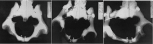 Figure 1. A well-aligned pelvis, left; subluxated pelvis, middle and right (Pistolese, 2002).